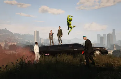 在这种模糊的冲动引导下,他们开始录制游戏画面,甚至还未完全掌握内容。于是,《大盗荒诞剧场》里,我们可以看到他们在洛杉矶山丘上的Vinewood露天剧场偶遇,并突发奇想要在那演《哈姆雷特》。很快,Grylls加入,成为拍摄的伙伴,并在游戏中纪录他们的努力。