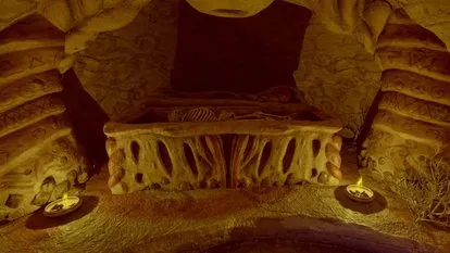 石棺位于一个菱形房间内,位于“封闭林地营地”西南方向。从营地出发,穿过大双门,进入有高大柱子和蜿蜒楼梯的房间。在楼梯底部,靠近浅水池的一面墙上,有一个凹陷处,里面藏着石棺。